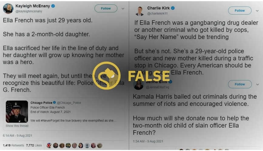 On Aug. 7, 2021, 29-year-old police officer Ella French was shot and killed during a traffic stop in Chicago. As this news started making its way around the internet, so did some misinformation about French’s death. On social media, many people incorrectly claimed that French was killed shortly after returning from maternity leave, and that she was the mother of a 2-month-old daughter.