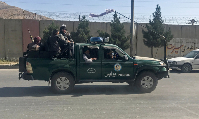 Các tay súng Taliban trên xe cảnh sát tuần tra Kabul sáng 16/8. Ảnh: Reuters.