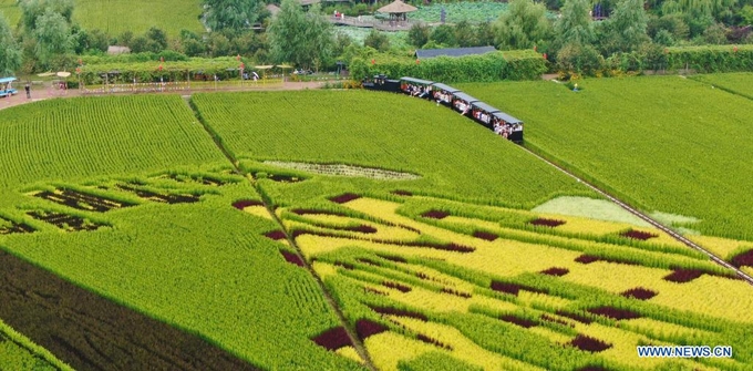 Du khách ngồi tàu, băng qua cánh đồng xanh mướt được ngắm những bức tranh tỉ mỉ, công phu bằng cách trồng đủ loại lúa nhiều màu sắc.