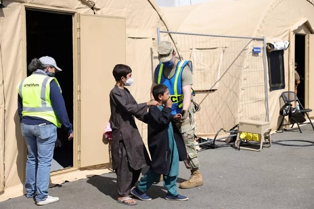 Những người sơ tán khỏi Afghanistan tại Căn cứ Không quân Ramstein vào ngày 26/8 ở Ramstein-Miesenbach, Đức. Ảnh: Getty