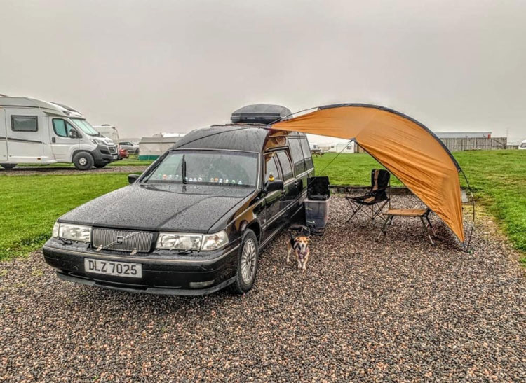 Shannon Orr, 24 tuổi và Iain Cameron, 31 tuổi đến từ Warrington, Anh. Họ đã lái xe dọc North Coast 500, một cung đường có cảnh quan tuyệt đẹp dài 830 km, nằm dọc bờ biển Bắc của Scotland. Điều đặc biệt là thay vì chở nhau trên một chiếc ôtô thông thường hoặc RV, xe chuyên dụng dành cho các chuyến du lịch xa, cặp đôi lại chọn một chiếc xe tang cũ - Volvo 960 Hearse 1998.Shannon cho biết khi nhìn thấy chiếc xe này được rao bán trên mạng, họ đã bỏ ra hơn 4.800 USD mua về. Chiếc xe đã được chủ cũ thay đổi nội thất bên trong, phù hợp cho các chuyến du lịch đường dài mà không cần sửa sang gì thêm. "Khi nhìn thấy chiếc xe trên Facebook, chúng tôi đã quyết định phải mua nó. Đó là thứ chúng tôi chưa từng thấy trước đây. Tôi tin rằng chiếc xe sẽ thu hút nhiều sự chú ý ở mọi nơi nó đến", Shannon nói. Dù là xe tang, họ vẫn lái nó giống như những chiếc ôtô bình thường khác. Chỉ có điều đôi khi nó không vừa với chỗ đậu xe vì hơi dài.