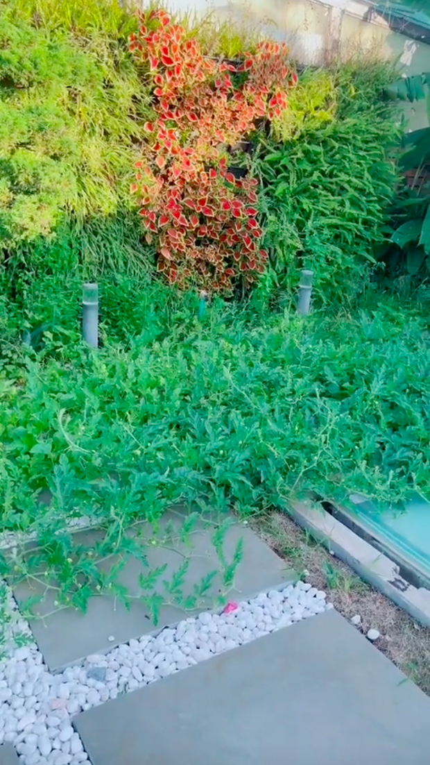 Trong clip mới nhất, anh chàng đã khoe một hiện tượng thú vị phát hiện trên mảnh vườn penthouse của mình sau khi về quê nghỉ dịch 1,5 tháng. Cụ thể, lúc quay lại anh đã thấy khu vườn bị “xâm chiếm” bởi một cây dưa hấu. Cây mọc lan khắp vườn, nhánh sum suê, bám cả diện tích đất trồng của các cây khác.