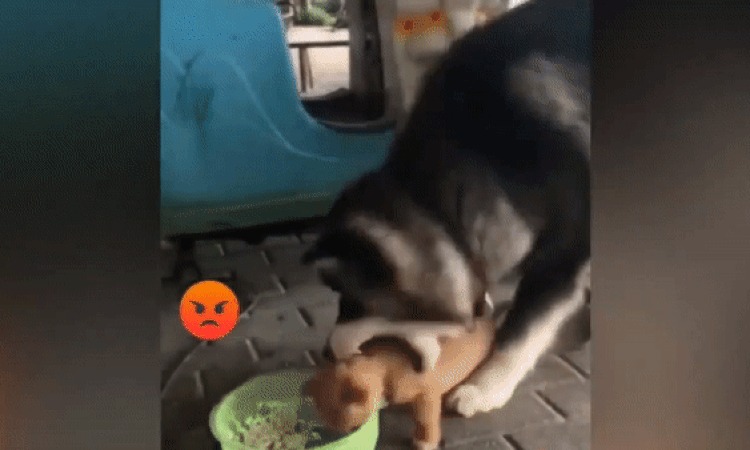 Chó Husky quyết phá bữa ăn của cún con