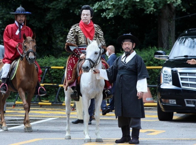 Heo mặc áp giáp thời chiến, cưỡi ngựa trắng, tới vận động tranh cử tại thành phố Goyang ngày 18/8. Ảnh: News Directory