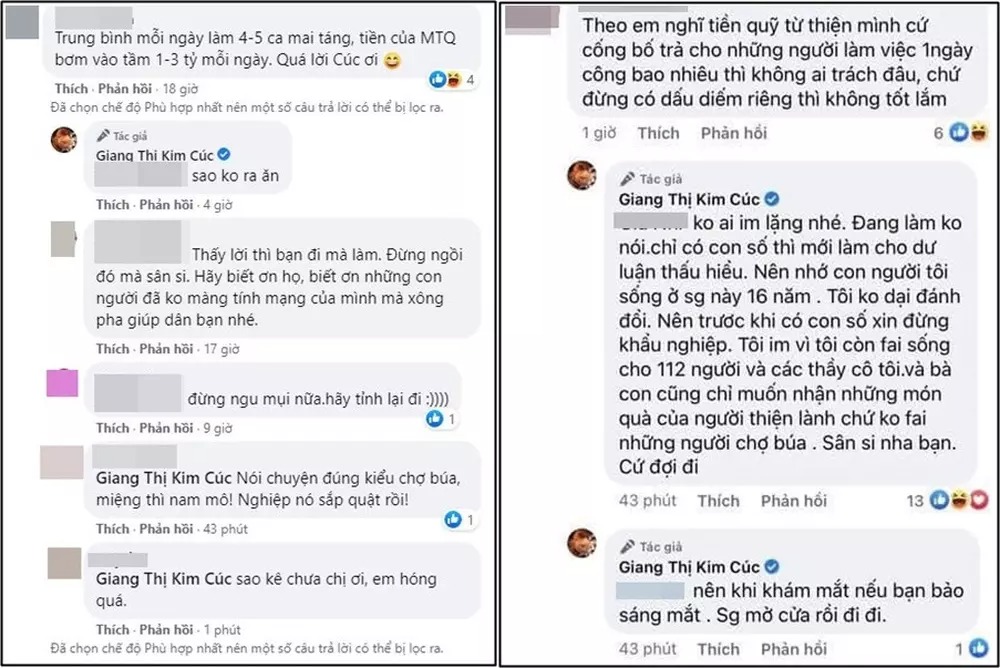 Nhiều người đã tràn vào trang cá nhân của cô để "chất vấn", thậm chí nói thẳng nghi ngờ "bớt xén" từ thiện. Giang Kim Cúc lập tức đáp trả rất gay gắt, tranh cãi tay đôi với dân mạng. Thậm chí, cô còn mỉa mia một người chỉ trích mình: "Nhà anh ai bị F0 nhớ inbox".