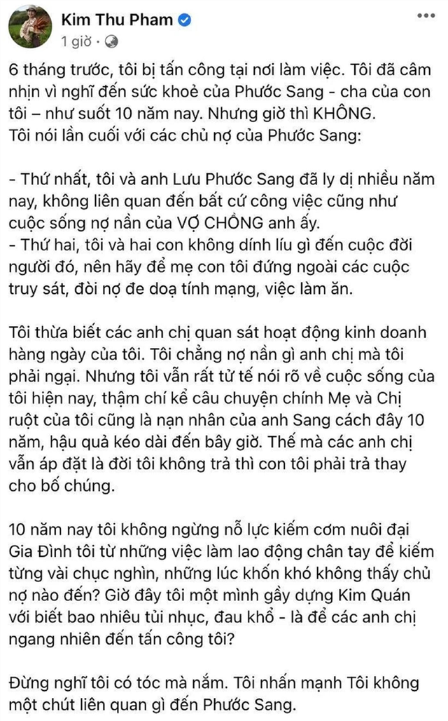 Bẵng đi một thời gian, diễn viên Kim Thư bất ngờ lên tiếng về lùm xùm của chồng cũ. Cụ thể, trên trang cá nhân, Kim Thư viết: "Gửi chủ nợ anh Sang. 6 tháng trước, tôi bị tấn công tại nơi làm việc. Tôi đã câm nhịn vì nghĩ đến sức khoẻ của Phước Sang - cha của con tôi, như suốt 10 năm nay. Nhưng giờ thì không. Tôi nói lần cuối với các chủ nợ của Phước Sang: