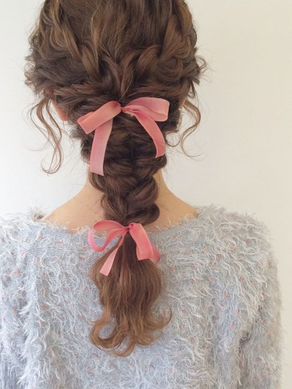 Hoặc bạn gái có thể tết tóc lỏng tay rồi đính ruy băng ở 2/3 lọn tóc và ở đuôi tóc như thế này.