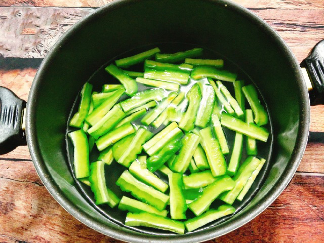 Bước 2: Đổ lượng nước vừa đủ vào nồi và đun sôi, thêm 1 thìa muối rồi cho khổ qua vào chần nhanh khoảng 1 phút thì vớt ra ngay. Ngâm khổ qua trong tô nước lạnh cho nguội thì vớt ra để thật ráo nước.