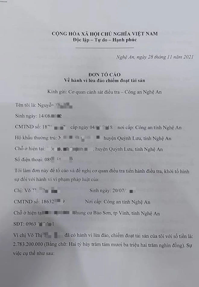 Những ngày qua, nhiều người dân tại TP. Vinh (Nghệ An) và một số người dân khác trên địa bàn tỉnh Nghệ An đã đồng loạt làm đơn gửi Cơ quan Cảnh sát điều tra Công an tỉnh Nghệ An tố cáo bà Võ Thị Thu H. (SN 1986, trú tại chung cư Bảo Sơn, phường Hưng Phúc, TP. Vinh) có hành vi chiếm đoạt của nhiều người với số tiền hàng chục tỷ đồng thông qua hình thức phường, hụi và bốc bát họ.