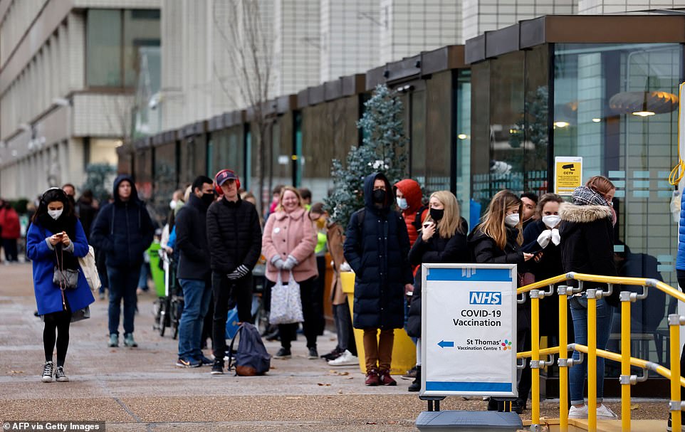 Người dân Anh chờ bên ngoài một điểm tiêm vaccine COVID-19. Ảnh: AFP