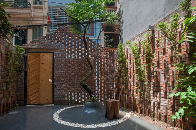 Cổng trước của nhà được ghép lại bởi những viên gạch xếp xen kẽ, tạo ra hàng rào thưa thớt, ngăn cách ngôi nhà với đường phố nhưng đồng thời chia sẻ không gian xanh với hàng xóm xung quanh.