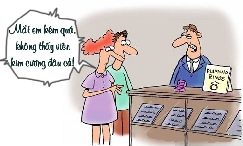 - Chồng ơi, dạo này mắt em kém đi hay sao ấy. Sao em nhìn mãi chẳng thấy được viên kim cương ở đâu cả.