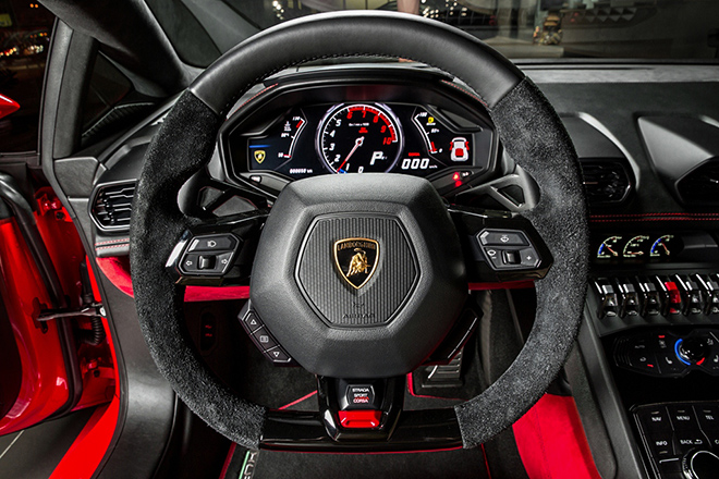 Bên trong nội thất, bệ trung tâm với màn hình màu TFT độ phân giải cao kích thước 12,3 inch, hệ thống thông tin giải trí Lamborghini Infotainment System II. Ghế ngồi thể thao được bọc da Alcantara sang trọng màu đen nổi bật trên trên những đường chỉ khâu màu đỏ. Màn hình màu TFT độ phân giải cao kích thước 12,3 inch. "Siêu bò" này còn được trang bị ba chế độ lái tích hợp ngay trên vô-lăng gồm có Strada (thông thường), Sport (thể thao) và Corsa (xe đua).
