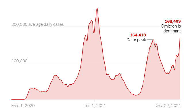 Biến chủng Omicron đang khiến đồ thị ca nhiễm mới tăng thẳng đứng tại nhiều thành phố ở Mỹ, trong đó số trường hợp nhiễm nCoV mới tăng gấp đôi sau 2-3 ngày. Ca nhiễm trung bình hàng ngày tại Mỹ hiện là 168.409, vượt qua mức đỉnh 164.418 trong làn sóng lây nhiễm do biến chủng Delta.
