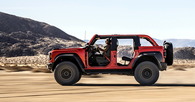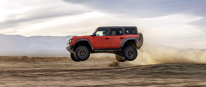 Không chỉ đơn thuần sở hữu một vẻ ngoài hầm hố hơn để phân biệt dễ dàng với Bronco thông thường, Bronco Raptor còn đi kèm một loạt các nâng cấp về hiệu suất và khả năng vận hành bên dưới vẻ ngoài cơ bắp. Được lấy cảm hứng từ Ultra-4 Racing, giải đua offroad một ngày khắc nghiệt nhất hành tinh hiện tại, Bronco Raptor sở hữu khả năng vượt địa hình đáng kinh ngạc với khả năng xử lý tốt trên cả đường cát, bùn, sỏi đá cả đường trường.