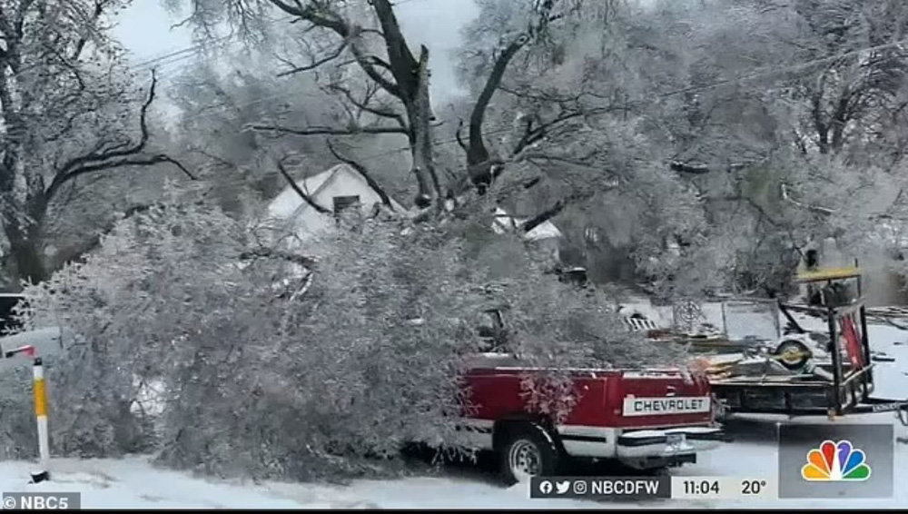 Nhiệt độ lạnh cóng làm đóng băng nước trong nhựa cây, gây ra trọng lượng dư thừa dọc theo các nhánh và làm cây đổ xuống. Ảnh: NBCDFW