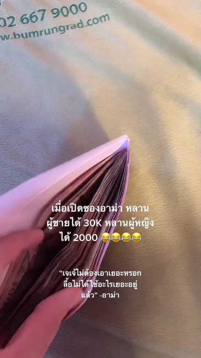 TikToker tự hào khoe: "Khi tôi mở phong bao của bà, cháu trai được 30.000 baht, cháu gái được 2000 baht. Jay Jay (tên người em gái) không phải lấy nhiều".
