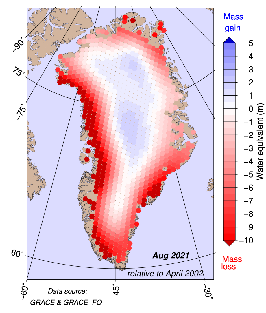 Bản đồ vệ tinh cho thấy các khu vực mất nhiều băng nhất (màu đỏ sẫm) ở Greenland tính đến tháng 8 năm 2021. Bờ biển phía Tây Greenland bị ảnh hưởng nặng nề nhất, có thể do nhiệt độ ấm lên ở Bắc Băng Dương.
