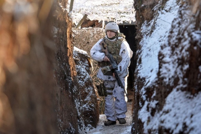 Lính vũ trang Ukraine đi dưới chiến hào gần ranh giới chia cắt với khu vực do quân ly khai kiểm soát ở vùng Donetsk, Ukraine hôm 5/2. Ảnh:Reuters.