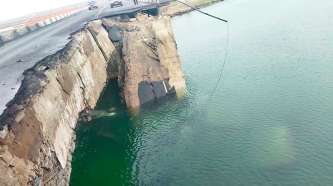 Cây cầu Henichesk bị phá hủy một phần. Ảnh: Daily Star.