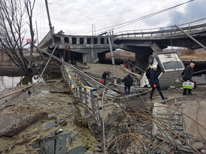 Người dân băng qua một cây cầu bị phá hủy khi sơ tán khỏi Irpin, thành phố phía bắc Kiev, ngày 6/3. Ảnh: AFP