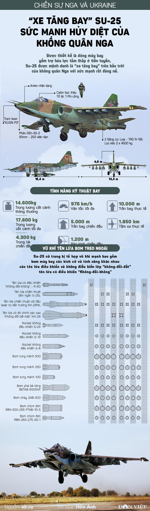 'Xe tăng bay' SU-25 sức mạnh hủy diệt của không quân Nga. Su-25 được mệnh danh là 'xe tăng bay' trên bầu trời của không quân Nga là dòng máy bay cường kích yểm trợ hỏa lực tầm thấp ở tiền tuyến, với sức mạnh rất đáng nể. Ngoài hỏa lực cực mạnh để chi viện mặt đất, Su-25 còn được thiết kế để tồn tại trước hỏa lực phòng không tầm thấp của đối phương.