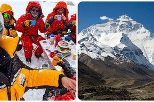 Nhà thám hiểm người Mỹ đã thực hiện ý tưởng táo bạo khi leo lên núi cao nhất thế giới và cùng bạn bè tổ chức uống trà, ăn bánh giữa cơn bão tuyết.