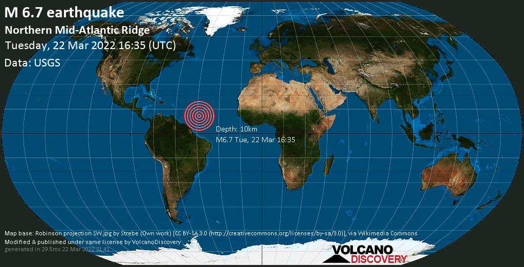 Trận động đất xảy ra vào hồi 16h 35 ngày 22/3 (tức 23h 35 cùng ngày giờ Hà Nội) một trận động đất có độ lớn 6,7 đã làm rung chuyển khu vực phía Bắc của khu vực Sống núi giữa Đại Tây Dương.