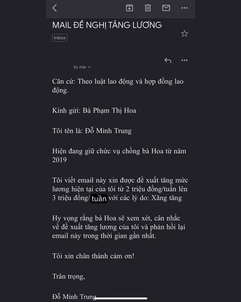"Tôi viết email này xin được đề xuất tăng mức lương hiện tại của tôi từ 2 triệu đồng/tuần lên 3 triệu đồng/tuần với các lý do: Xăng tăng", anh tiếp tục trình bày.