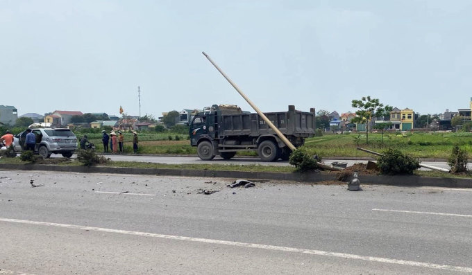 Tại hiện trường, cột điện giữa đường đổ nghiêng, mảnh vỡ chiếc xe màu đen bắn tung tóe trên quãng đường dài khoảng 30 m. Xe biến dạng, hư hỏng nặng.
