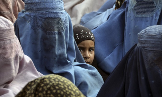 Phụ nữ Afghanistan mặc burqa tại một điểm tiếp nhận lương thực ở Kandahar hôm 27/4. Ảnh: AFP.
