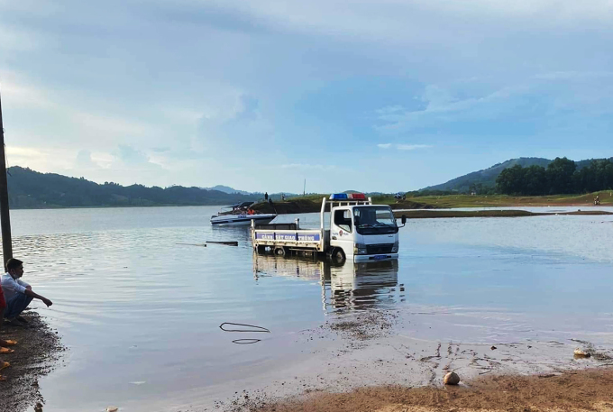Cano, ôtô CSGT kéo thuyền và tìm kiếm người mất tích. Ảnh: Hắc Minh