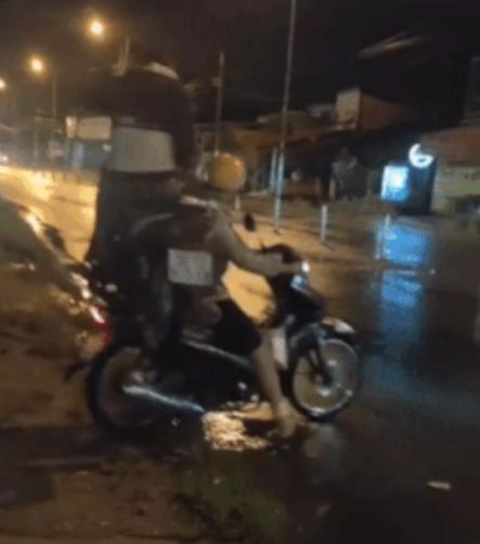Ngoài ra có thể thấy đường phố lúc này đã về đêm nhưng vẫn còn khá đông phương tiện di chuyển. Dưới đường thì vẫn còn ẩm ướt do cơn mưa đêm vừa tạnh. Với một người bình thường khi lái xe, để có thể đảm bảo an toàn trong đường tối trơn trượt như thế này vốn đã không hề dễ, nay lại phải 'gánh' thêm một xe một người cồng kềnh phía sau thật sự rất nguy hiểm.