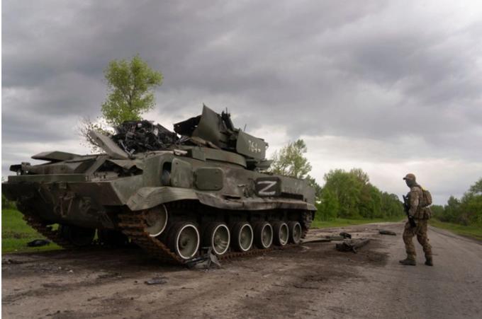 Binh sĩ Ukraine đứng gần một xe quân sự Nga bỏ lại ở phía bắc Kharkov ngày 15/5 (Ảnh: AP).