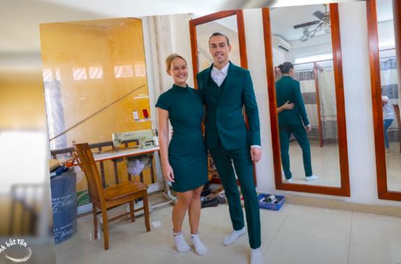 Cặp đôi rất thích thú về trải nghiệm khác lạ tại cửa hàng may mặc ở Hội An, đồng thời càng cảm thấy hài lòng hơn khi hiểu được rằng, việc lấy số đo kĩ lưỡng là điều bắt buộc để các thợ may có thể tạo ra sản phẩm vừa "như in" cho khách hàng.