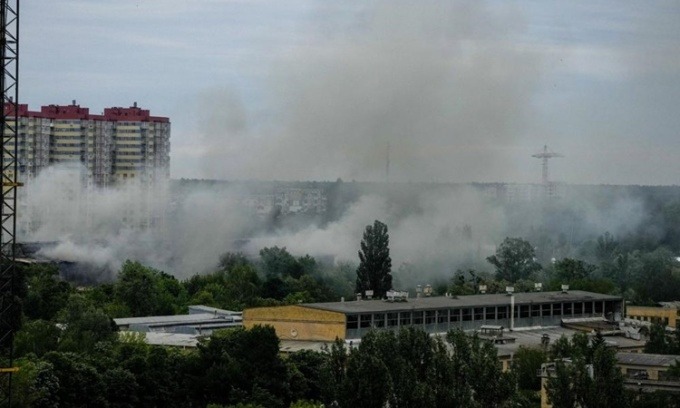 Khói bốc lên sau cuộc tấn công bằng tên lửa của Nga ở thủ đô Kiev, Ukraine, ngày 5/6. Ảnh:AP.