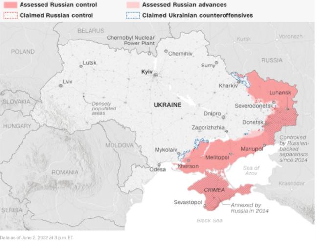 Sơ đồ các vùng của Ukraine mà Nga tuyên bố đã kiểm soát được và đang bao vây. Ảnh CNN