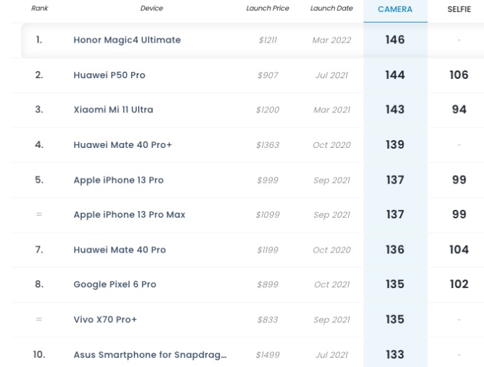 Honor Magic4 Ultimate được đánh giá là smartphone chụp ảnh đẹp nhất, trong khi iPhone 13 Pro Max đứng thứ năm, theo kết quả của DxO Mark.