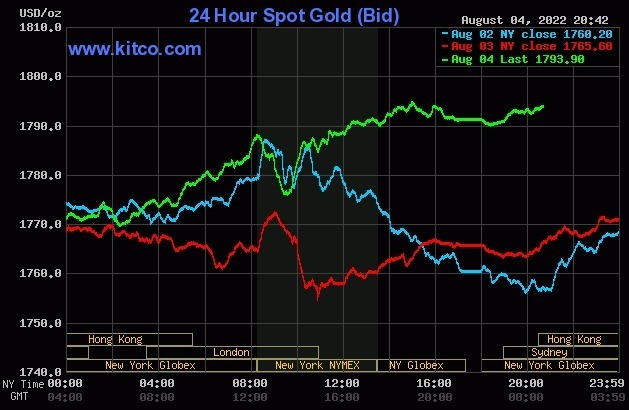 Trong phiên giao dịch 4/8, giá vàng thế giới giao ngay có thời điểm tăng gần 2%, chạm 1.794 USD một ounce. Đây là mức cao nhất kể từ ngày 5/7. Sang phiên sáng nay, giá hiện vẫn xoay quanh mốc này.