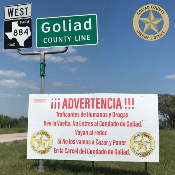 “Cảnh báo! Những kẻ buôn người và ma túy: Hãy quay lại, cấm vào Quận Goliad,” các biển báo viết. “Hãy quay lại. Nếu không, chúng tôi sẽ truy lùng các người và tống các người vào nhà tù Quận Goliad.”