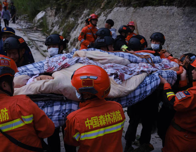 Lực lượng cứu hộ di chuyển một người sống sót sau trận động đất ở tỉnh Tứ Xuyên - Trung Quốc hôm 5-9. Ảnh: Tân Hoa xã
