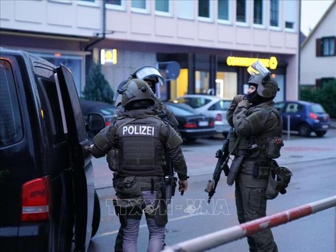 Cảnh sát Đức phong tỏa hiện trường vụ xả súng và ẩu đả trên đường phố Essling ở thị trấn Plochingen (bang Baden-Württemberg) tối 13/2/2020. Ảnh minh hoạ: DPA/TTXVN