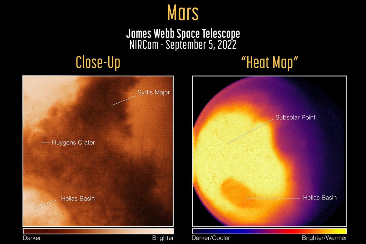 Bức ảnh do NASA công bố cho thấy bên trái là bản đồ tham chiếu của bán cầu Đông do tàu Mars Global Surveyor chụp (tàu vũ trụ này dừng hoạt động vào năm 2006). Phía trên bên phải là ảnh chụp của James Webb, thể hiện ánh sáng Mặt Trời phản chiếu trên bề mặt sao Hỏa và nhiều cấu trúc như hố trũng Huygens, đá núi lửa sẫm màu và lòng chảo Hellas - hố va chạm dài tới 2.000 km. Hình ảnh phía dưới bên phải thể hiện sự phát nhiệt của sao Hỏa hay ánh sáng do Hành tinh Đỏ phát ra khi mất nhiệt. Các khu vực sáng nhất là những nơi ấm nhất.