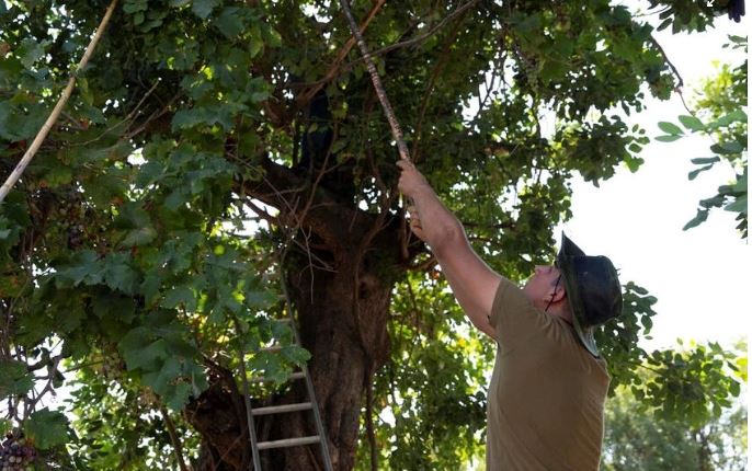 Để hái quả carob, ông Charalambous và cháu trai Christou rung mạnh các cành cây, đồng thời dùng que dài đập vào lớp vỏ những quả carob treo lủng lẳng trên cành, khiến chúng rơi xuống đất như mưa.