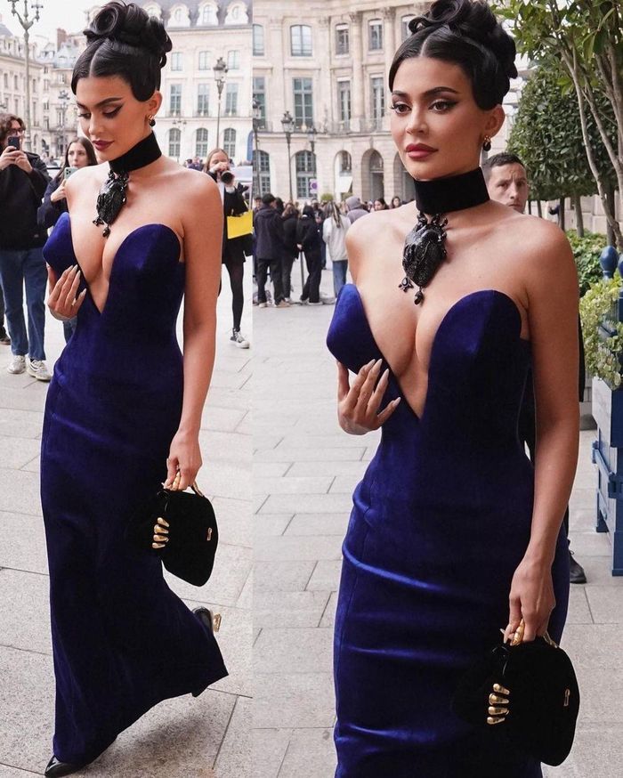 Ngày 29/9, mỹ nhân 25 tuổi chọn chiếc đầm nhung xanh dài ôm sát với phần xẻ ngực chữ V xuống đến bụng rời khách sạn khi đi sự kiện. Tuy nhiên do phần ngực quá hở, cộng thêm Kylie Jenner không mặc áo ngực nên cô khá vất vả khi di chuyển trước ống kính.