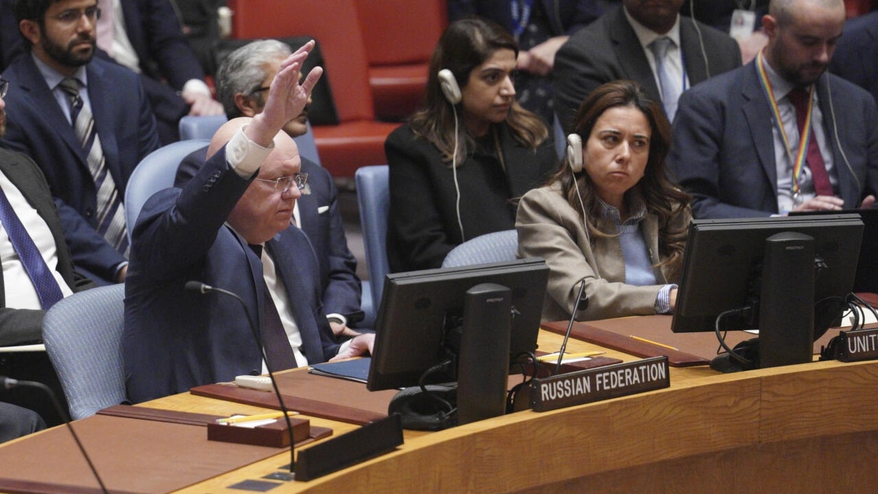Đại sứ Nga tại Liên Hiệp Quốc Vasily Nebenzya giơ tay phủ quyết nghị quyết của Hội Đồng Bảo An lên án việc Nga sáp nhập 4 vùng của Ukraina. Trụ sở Liên Hiệp Quốc, New York, Hoa Kỳ, ngày 30/09/2022. AP - Bebeto Matthews