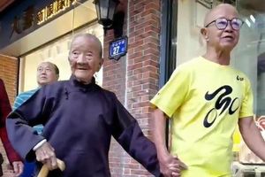 Trên phố, người con trai 88 tuổi nắm chặt tay mẹ 110 tuổi khiến nhiều người ngưỡng mộ, vây quanh, chụp ảnh.