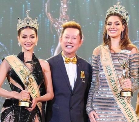 Ông Nawat Itsaragrisil, Chủ tịch cuộc thi Miss Grand International 2022, bên đương kim hoa hậu cuộc thi (phải)
