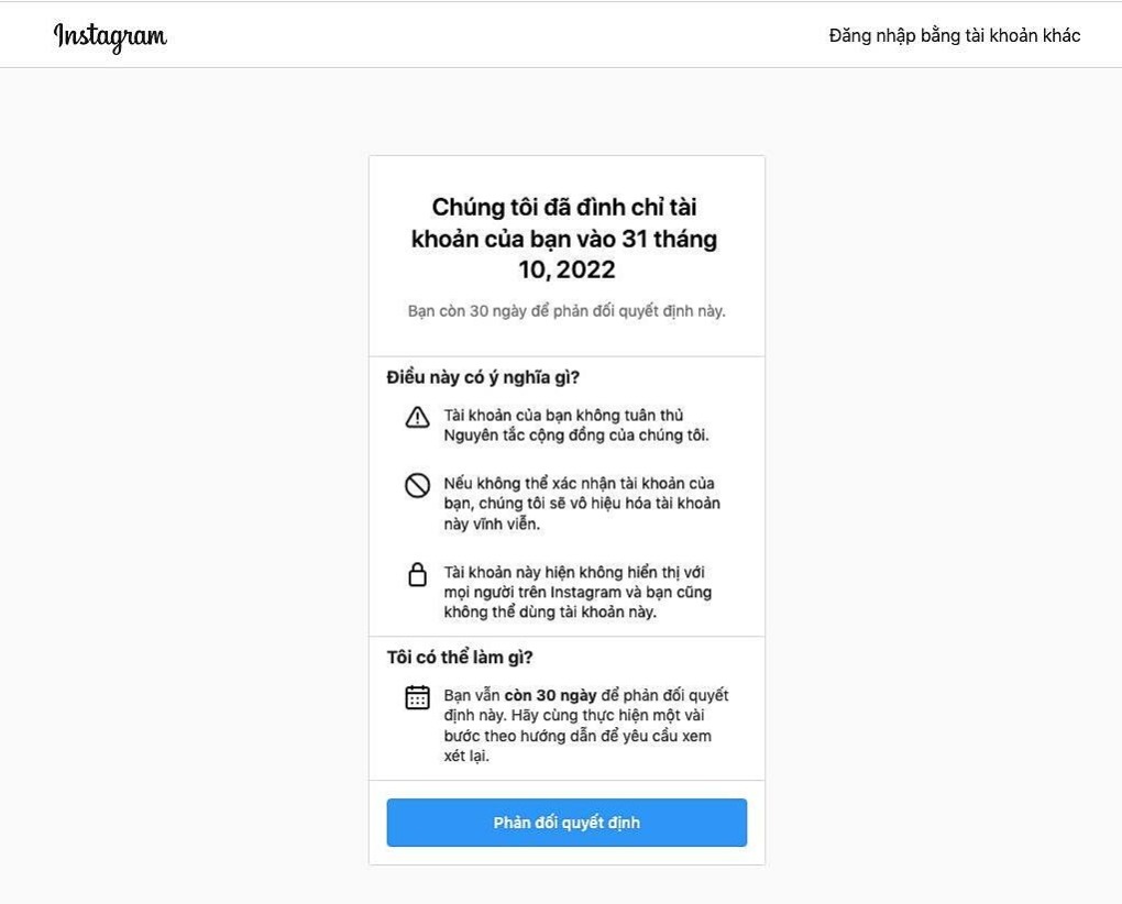 Thanh Hiền không phải người duy nhất gặp vấn đề với Instagram. Từ tối qua, theo The Verge, hàng triệu nhiều người dùng khắp thế giới cũng gặp tình trạng không thể vào tài khoản Instagram. Khi truy cập, mạng xã hội này thông báo "Chúng tôi đã đình chỉ tài khoản của bạn vào ngày 31/10. Bản còn 30 ngày để phản đối quyết định này".