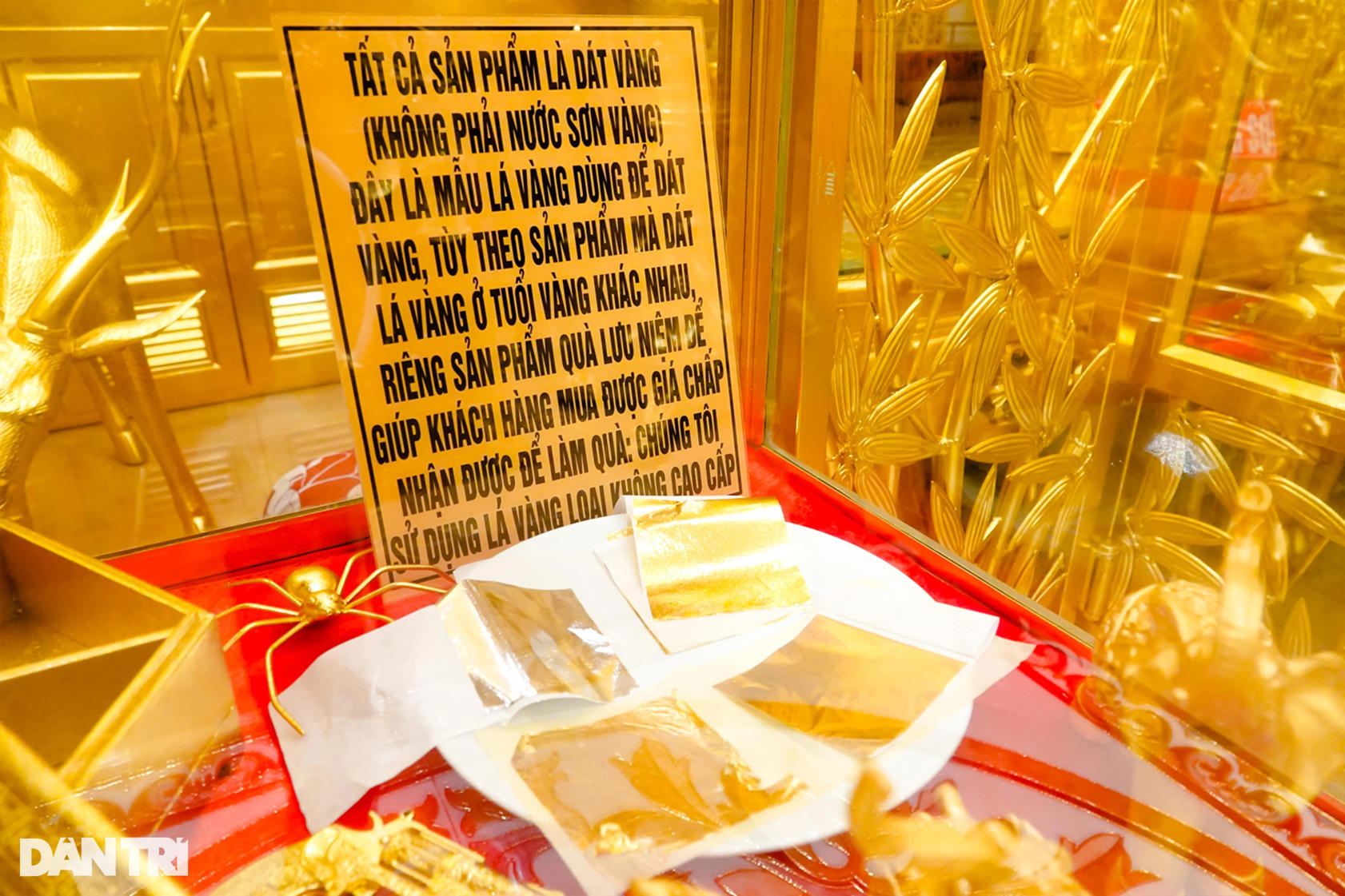 Anh Hồng Phát (nhân viên nhà dát vàng) cho biết, mỗi món đồ được dát bằng lá vàng không phải sơn như mọi người nhầm lẫn, tùy theo sản phẩm mà lá vàng được dát ở độ tuổi khác nhau. Riêng các sản phẩm quà lưu niệm sẽ được dát bằng loại lá vàng không cao cấp.
